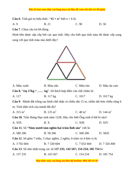 Câu 6. Tính giá trị biểu thức: “15 × n” biết n = 6 là: A. 9 B. 21 C. 90 D. 50