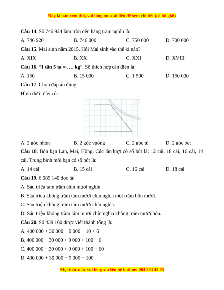 Câu 14. Số 746 924 làm tròn đến hàng trăm nghìn là: A. 746 920 B. 746 000 C. 750 000 D. 700 000