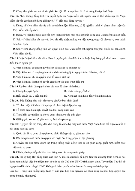 Câu 15. Viện kiểm sát nhân dân có mấy chức năng chính? A. Hai. B. Ba. C. Bốn. D. Năm.