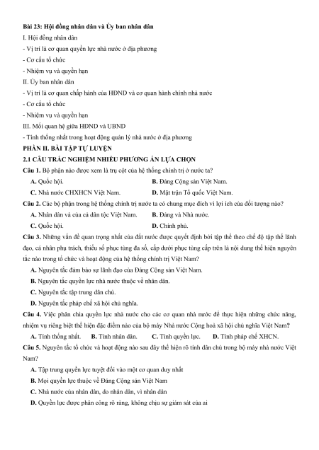 Câu 6. Nguyên tắc “mọi quyền lực nhà nước thuộc về nhân dân” trong tổ chức bộ máy nhà nước Việt