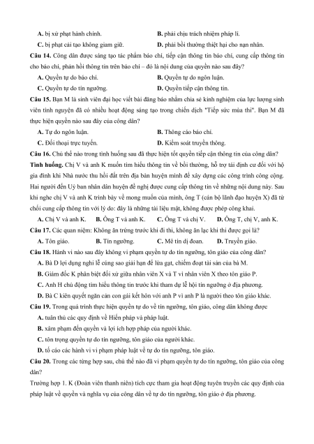 Câu 20. Trong các từng hợp sau, chủ thể nào đã vi phạm quyền tự do tín ngưỡng, tôn giáo của công dân?