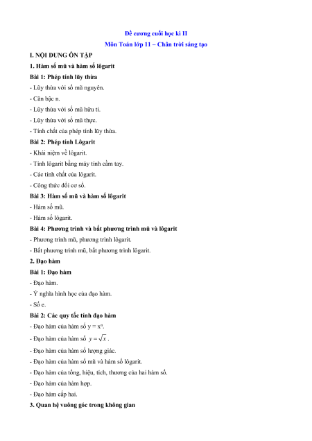 Môn Toán lớp 11 – Chân trời sáng tạo I. NỘI DUNG ÔN TẬP