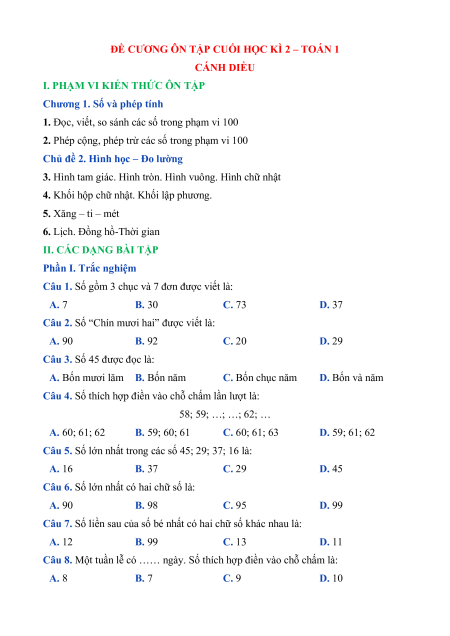 ĐỀ CƯƠNG ÔN TẬP CUỐI HỌC KÌ 2 – TOÁN 1 CÁNH DIỀU