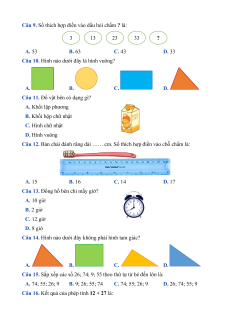 Câu 15. Sắp xếp các số 26; 74; 9; 55 theo thứ tự từ bé đến lớn là: A. 74; 55; 26; 9 B. 9; 26; 55; 74 C. 74; 55; 26; 9 D. 26; 74; 55; 9
