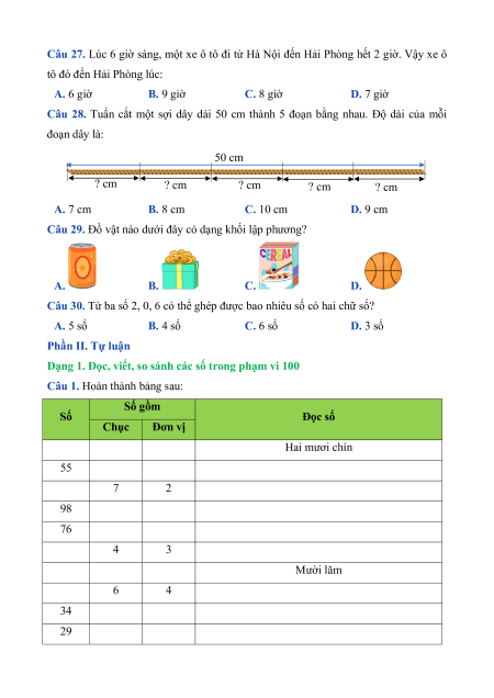 Câu 28. Tuấn cắt một sợi dây dài 50 cm thành 5 đoạn bằng nhau. Độ dài của mỗi đoạn dây là: 50 cm ? cm ? cm ? cm ? cm ? cm A. 7 cm B. 8 cm C. 10 cm D. 9 cm