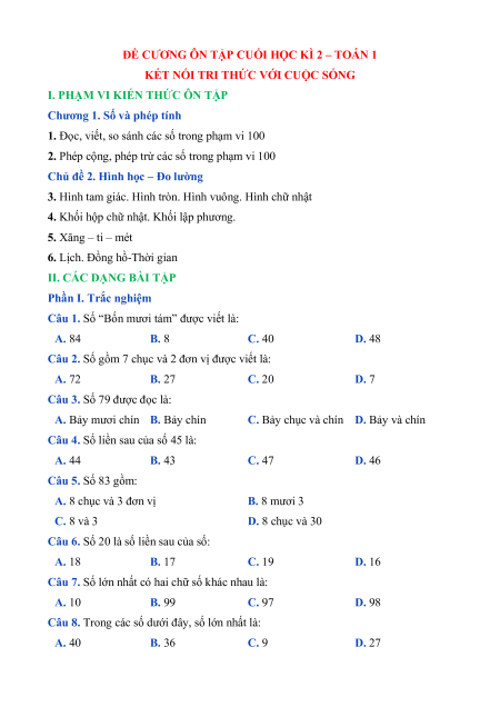 ĐỀ CƯƠNG ÔN TẬP CUỐI HỌC KÌ 2 – TOÁN 1