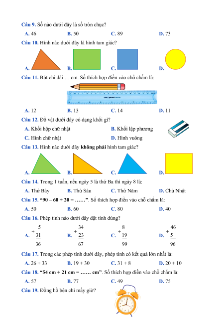 Câu 9. Số nào dưới đây là số tròn chục? A. 46 B. 50 C. 89 D. 73