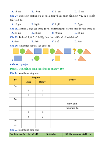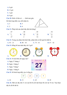 Câu 27. Lúc 5 giờ, một xe ô tô đi từ Hà Nội về Bắc Ninh hết 2 giờ. Vậy xe ô tô đến Bắc Ninh lúc: A. 10 giờ B. 9 giờ C. 8 giờ D. 7 giờ