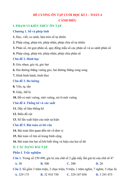 ĐỀ CƯƠNG ÔN TẬP CUỐI HỌC KÌ 2 – TOÁN 4 CÁNH DIỀU
