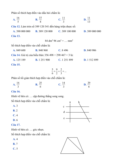 Câu 12. Làm tròn số 389 120 341 đến hàng triệu được số: A. 390 000 000 B. 389 120 000 C. 389 100 000 D. 389 000 000 Câu 13. 84 dm2 96 cm2 = … mm2
