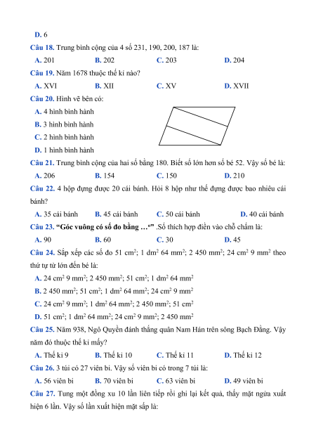 Câu 18. Trung bình cộng của 4 số 231, 190, 200, 187 là: A. 201 B. 202 C. 203 D. 204