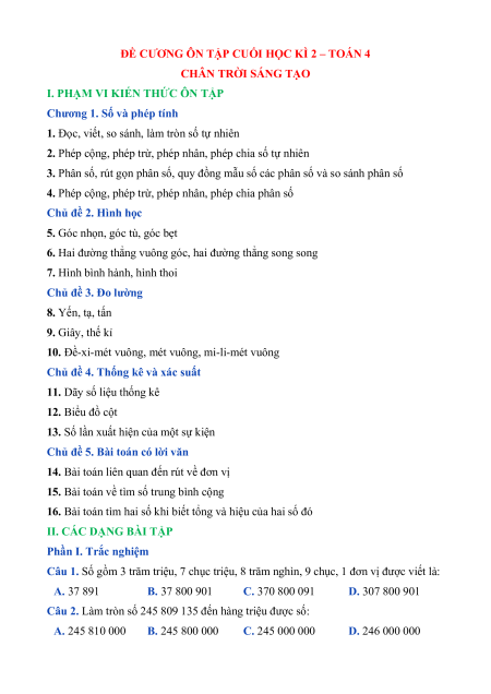ĐỀ CƯƠNG ÔN TẬP CUỐI HỌC KÌ 2 – TOÁN 4