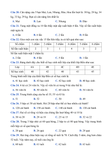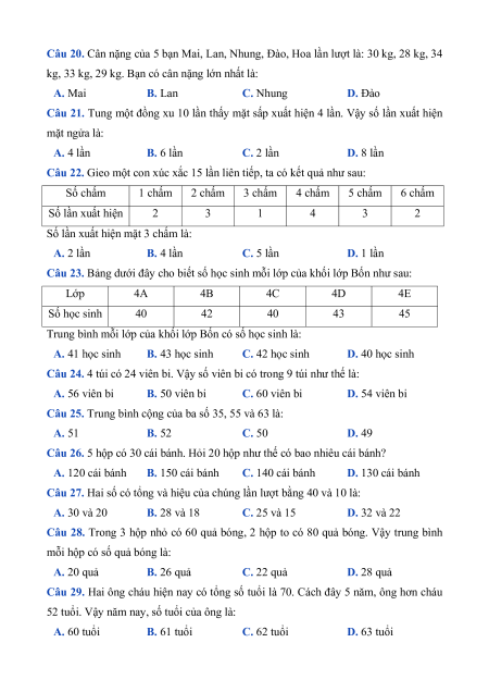 Câu 20. Cân nặng của 5 bạn Mai, Lan, Nhung, Đào, Hoa lần lượt là: 30 kg, 28 kg, 34