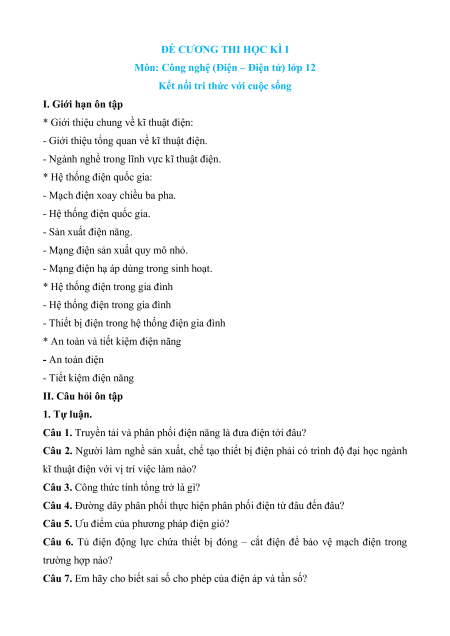 Đề cương ôn tập Cuối kì 1 Công nghệ 12 Điện, Điện tử Kết nối tri thức