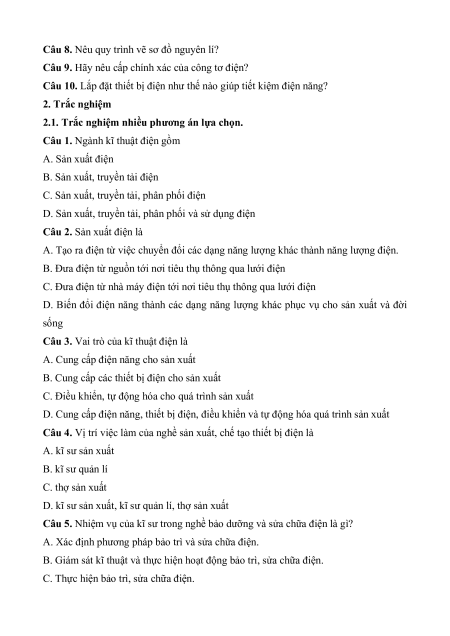 Câu 1. Ngành kĩ thuật điện gồm A. Sản xuất điện