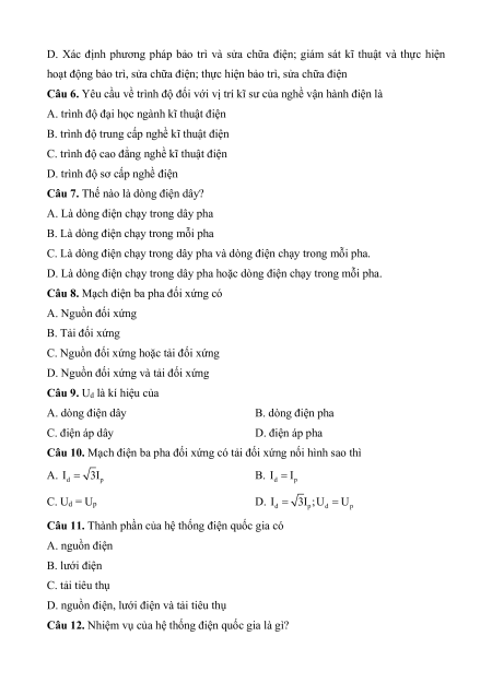 Câu 9. Ud là kí hiệu của A. dòng điện dây B. dòng điện pha C. điện áp dây D. điện áp pha