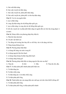 Câu 16. Phương pháp nhiệt điện sử dụng nguyên liệu nào sau đây? A. Than đá B. Khí C. Dầu D. Than đá, khí, dầu.