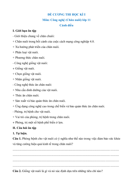 Đề cương ôn tập Cuối kì 1 Công nghệ chăn nuôi 11 Cánh diều (có đáp án)