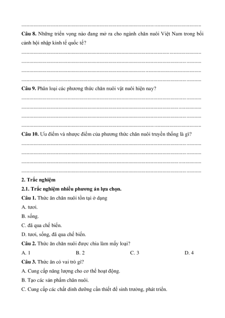 Câu 1. Thức ăn chăn nuôi tồn tại ở dạng A. tươi. B. sống. C. đã qua chế biến.