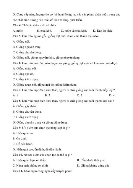 Câu 6. Dựa vào mức độ hoàn thiện của giống, giống vật nuôi có loại nào dưới đây? A. Giống nhập nội. B. Giống quá độ. C. Giống kiêm dụng.