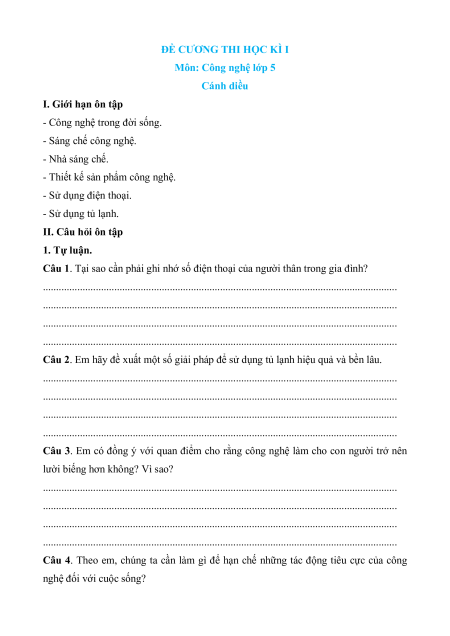 - Tailieugiaovien.com.vn giới thiệu bộ đề cương Cuối kì 1 Công nghệ lớp 5 Cánh diều mới nhất nhằm giúp Giáo viên có thêm tài liệu tham khảo ra đề thi Công nghệ lớp 5.