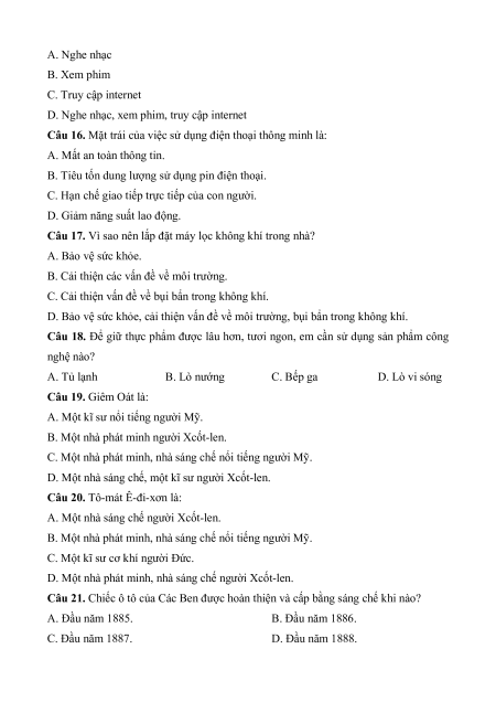 Câu 9. Sáng chế giúp cho việc di chuyển của con người ngày càng trở nên thuận tiện hơn là gì? A. Bóng đèn. B. Động cơ hơi nước. C. Ô tô. D. Điện thoại.
