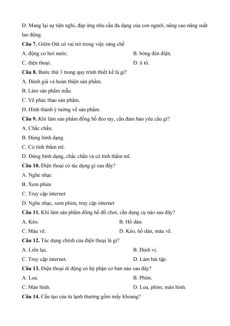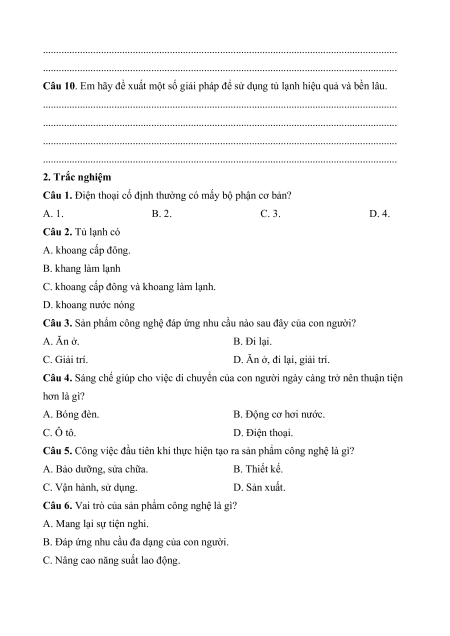 Câu 3. Sản phẩm công nghệ đáp ứng nhu cầu nào sau đây của con người? A. Ăn ở. B. Đi lại. C. Giải trí.