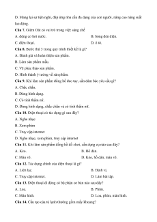 Câu 11. Khi làm sản phẩm đồng hồ đồ chơi, cần dụng cụ nào sau đây? A. Kéo. B. Hồ dán. C. Màu vẽ. D. Kéo, hồ dán, màu vẽ.