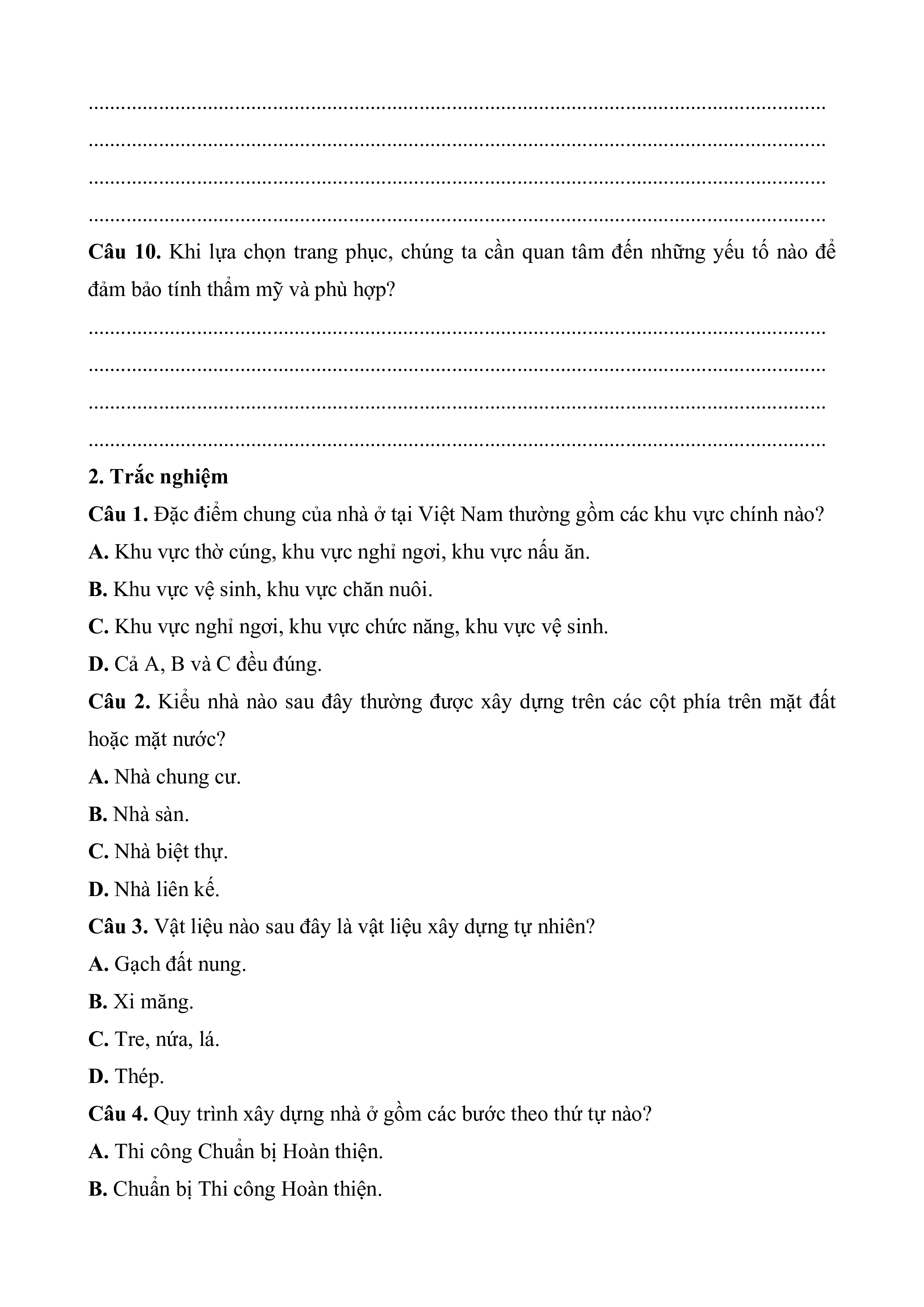 Câu 2. Kiểu nhà nào sau đây thường được xây dựng trên các cột phía trên mặt đất hoặc mặt nước? A. Nhà chung cư. B. Nhà sàn. C. Nhà biệt thự. D. Nhà liên kế.
