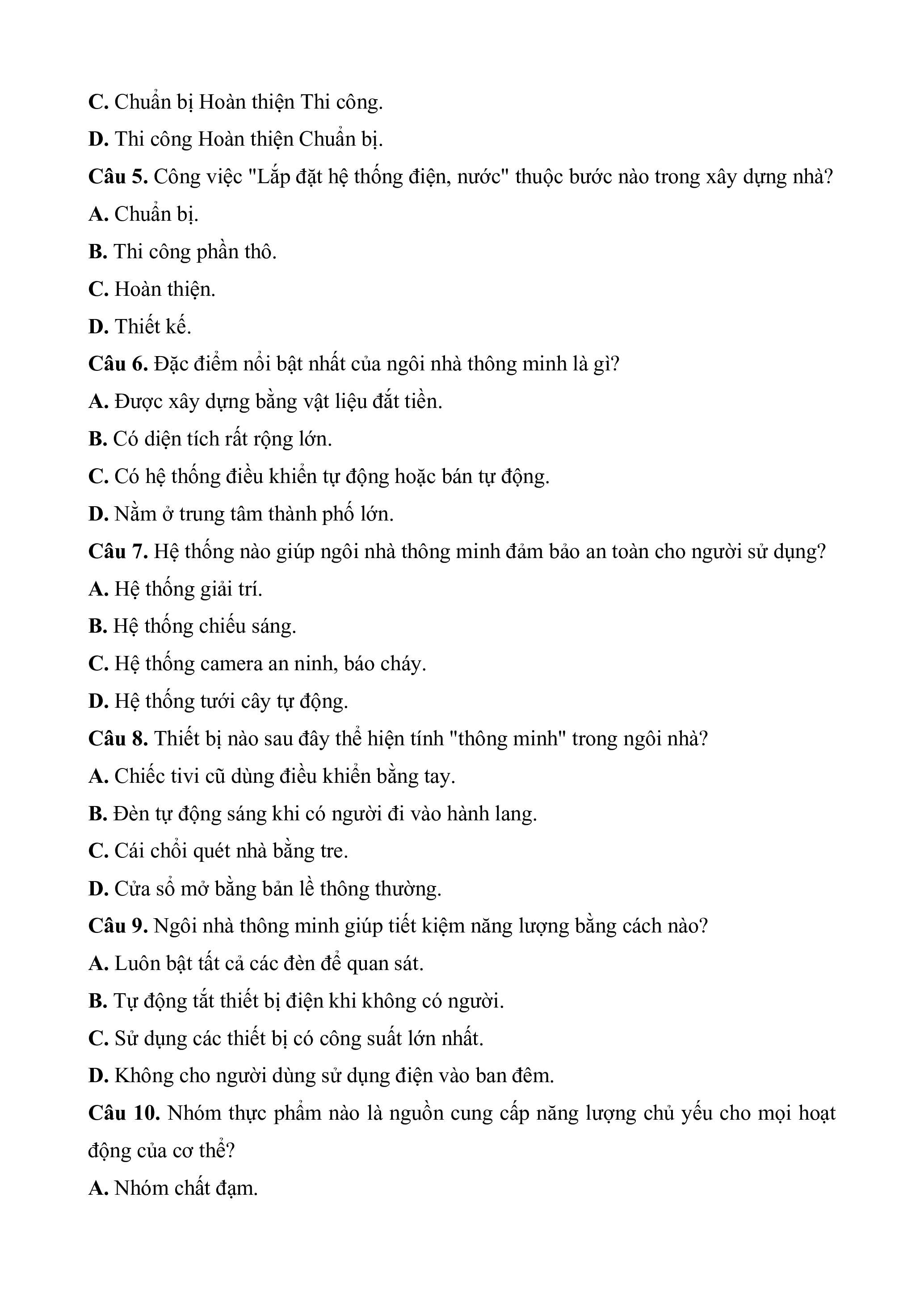 Câu 5. Công việc "Lắp đặt hệ thống điện, nước" thuộc bước nào trong xây dựng nhà? A. Chuẩn bị.