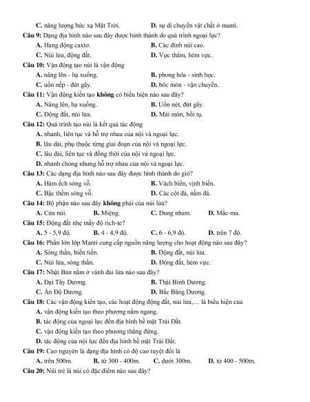 Câu 18: Các vận động kiến tạo, các hoạt động động đất, núi lửa,… là biểu hiện của
