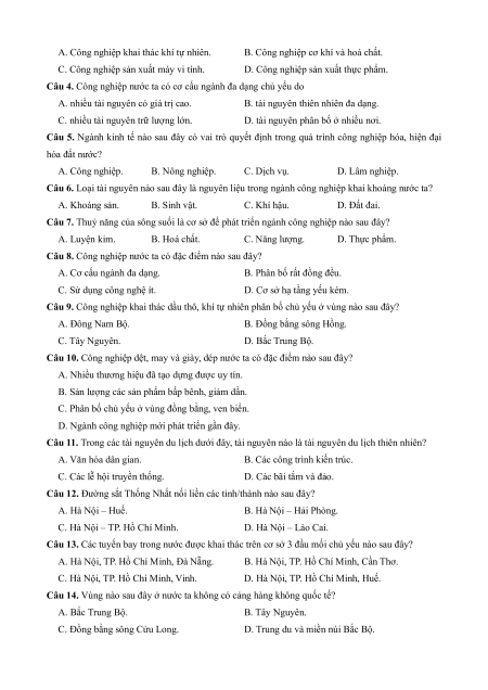 Câu 9. Công nghiệp khai thác dầu thô, khí tự nhiên phân bố chủ yếu ở vung nào sau đây? A. Đông Nam Bộ. B. Đồng băng sông Hồng. C. Tây Nguyên. D. Băc Trung Bộ.