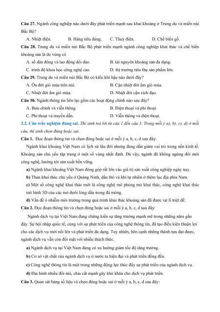 Câu 27. Ngành công nghiệp nào dưới đây phát triển mạnh sau khai khoáng ở Trung du và miền núi Băc Bộ? A. Nhiệt điện. B. Hàng tiêu dung. C. Thuỷ điện. D. Chế biến gỗ.