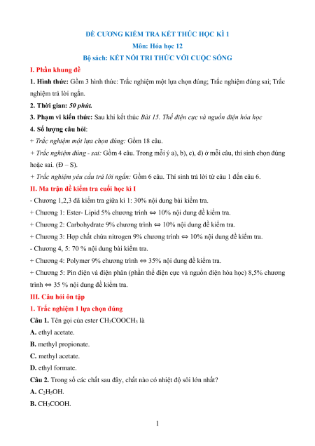 Đề cương ôn tập Cuối kì 1 Hóa học 12 Kết nối tri thức