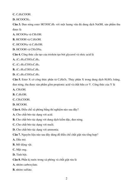 Câu 2. Trong số các chất sau đây, chất nào có nhiệt độ sôi lớn nhất? A. C2H5OH. B. CH3COOH. 1 C. C2H5COOH. D. HCOOCH3.