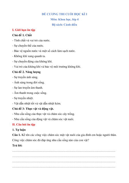 Đề cương ôn tập Cuối kì 1 Khoa học lớp 4 Cánh diều