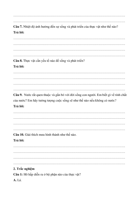 Câu 8. Thực vật cần yếu tố nào để sống và phát triển? Trả lời: