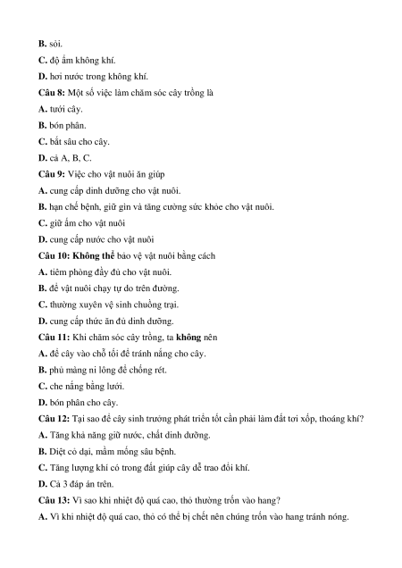 Câu 4: Động vật không cần yếu tố nào sau đây để sống và phát triển? A. Không khí. B. Sỏi. C. Ánh sáng. D. Nước.