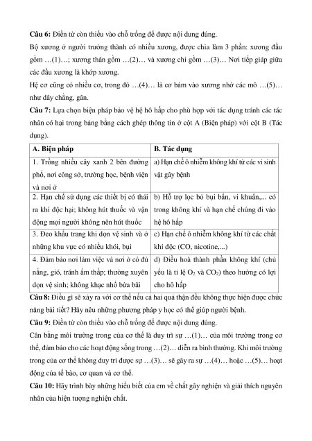 Câu 7: Lựa chọn biện pháp bảo vệ hệ hô hấp cho phù hợp với tác dụng tránh các tác