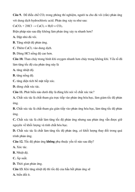 Câu 8. Để đánh giá mức độ diễn ra nhanh hay chậm của phản ứng hóa học người ta