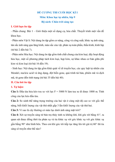 Đề cương ôn tập Cuối kì 1 Khoa học tự nhiên 9 Chân trời sáng tạo