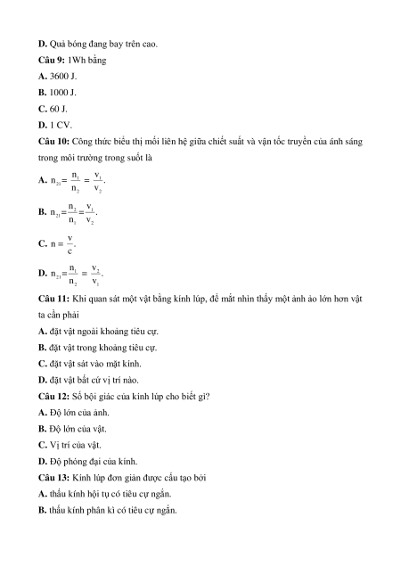 - Phân môn Vật lí: Nội dung ôn tập gồm cơ năng, công và công suất, khúc xạ ánh sáng,