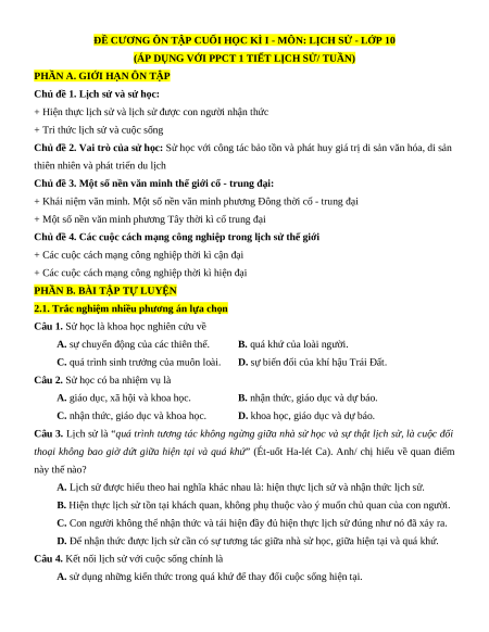 - Tailieugiaovien.com.vn giới thiệu Đề cương ôn tập Cuối kì 1 Lịch Sử 10 cấu trúc mới (1 tiết/tuần) chung cho 3 sách: Kết nối, Cánh diều, Chân trời sáng tạo mới nhất nhằm giúp Giáo viên có thêm tài liệu tham khảo ra đề thi Lịch sử 10.