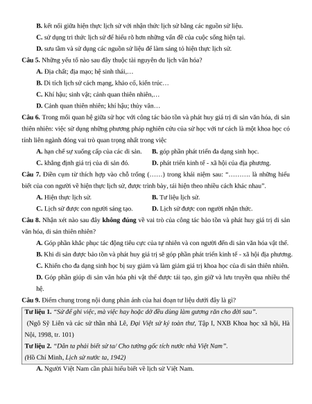 Câu 6. Trong mối quan hệ giữa sử học với công tác bảo tồn và phát huy giá trị di sản văn hóa, di sản
