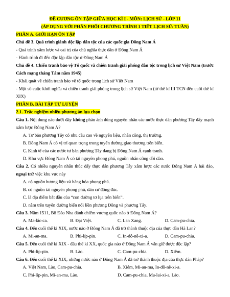 ĐỀ CƯƠNG ÔN TẬP GIỮA HỌC KÌ I - MÔN: LỊCH SỬ - LỚP 11