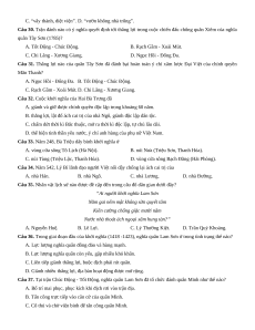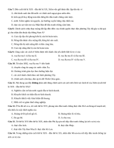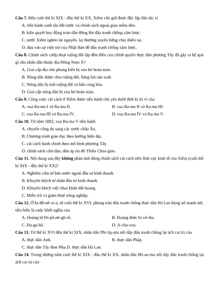 Câu 9. Công cuộc cải cách ở Xiêm được tiến hành chủ yếu dưới thời kì trị vì của A. vua Ra-ma I và Ra-ma II. B. vua Ra-ma II và Ra-ma III. C. vua Ra-ma III và Ra-ma IV. D. vua Ra-ma IV và Ra-ma V.