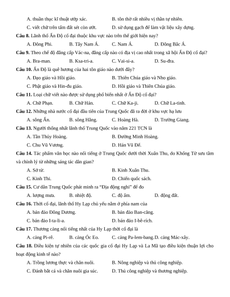 Câu 8. Lãnh thổ Ấn Độ cổ đại thuộc khu vực nào trên thế giới hiện nay? A. Đông Phi. B. Tây Nam Á. C. Nam Á. D. Đông Bắc Á.