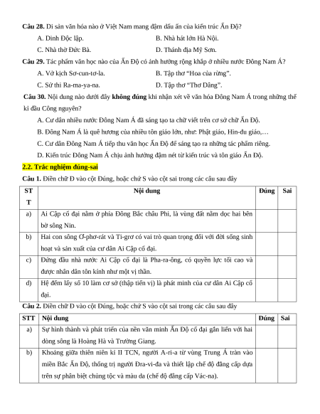 Câu 28. Di sản văn hóa nào ở Việt Nam mang đậm dấu ấn của kiến trúc Ấn Độ? A. Dinh Độc lập. B. Nhà hát lớn Hà Nội. C. Nhà thờ Đức Bà. D. Thánh địa Mỹ Sơn.