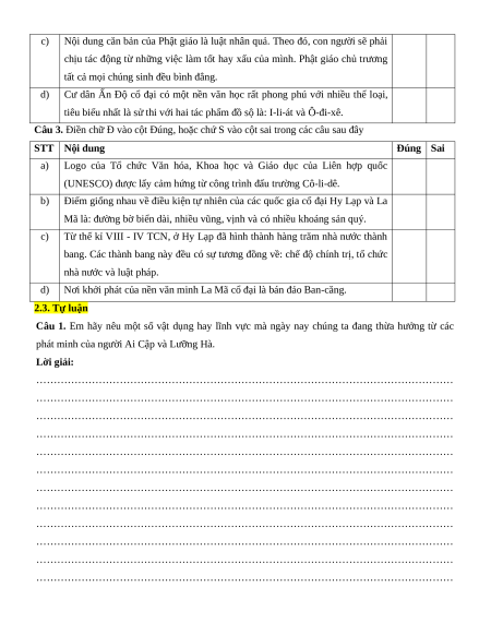 Câu 1: Dòng sông nào gắn liền với sự hình thành và phát triển của nền văn minh Ai Cập cổ đại? A. Sông Nin.