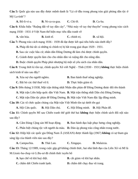 Câu 5: Quốc gia nào sau đây được mệnh danh là “Lá cờ đầu trong phong trào giải phóng dân tộc ở Mỹ La-tinh"? A. Bô-li-vi-a. B. Ni-ca-ra-goa. C. Chi-lê. D. Cu-ba.